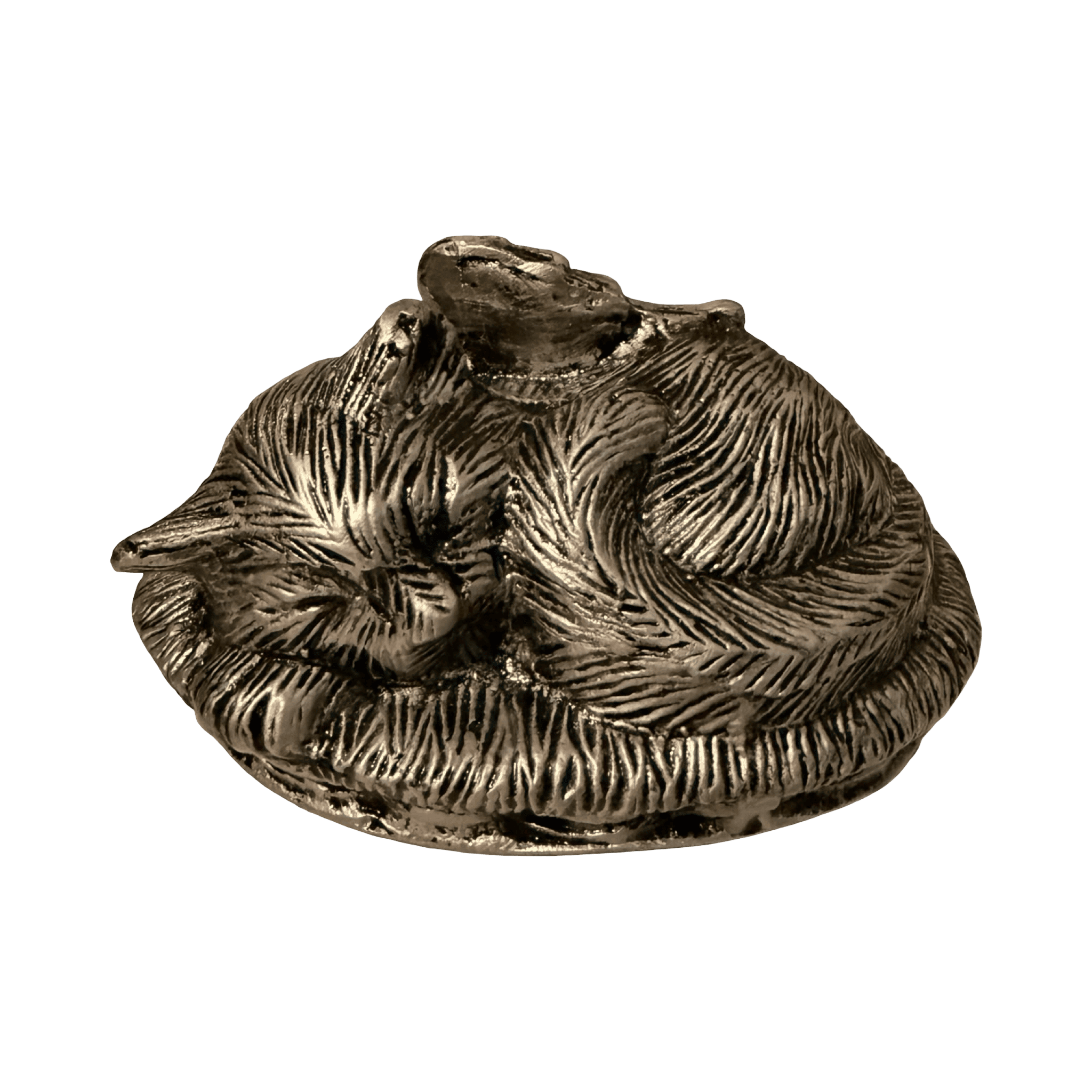 Hasta 7kgs. Esta delicada ánfora en forma de gato dormido con alas transmite una profunda sensación de paz y descanso eterno. Fundida en aluminio, representa a un felino acurrucado sobre una base que imita un cesto trenzado, ideal para quienes desean rendir homenaje a un ser querido con calidez, amor y serenidad. Su diseño detallado y artesanal la convierte en una pieza única, perfecta para hogares que valoran el simbolismo y la estética en sus recuerdos. La parte inferior o trasera del ánfora cuenta con una apertura discreta para el resguardo seguro de cenizas.