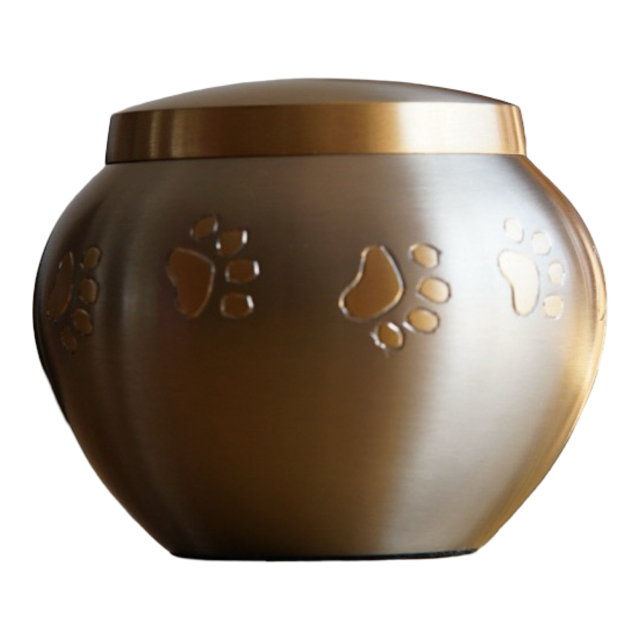 Hasta 15kgs. Una pieza sólida y elegante, esta ánfora metálica de acabado bronce satinado con huellas talladas evoca la fortaleza y el legado de tu mascota. Su forma redondeada y firme simboliza la eternidad, mientras que las huellas grabadas en relieve nos recuerdan que su amor sigue presente, aunque su presencia física ya no esté.